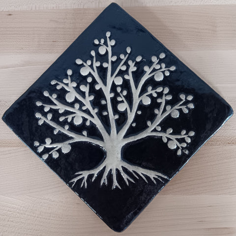 This tree of life design has been around almost as long as Emu Tile! Since it is one of the first designs I ever came up with, I have had lots of time to make variations of it, including this one which is on the diagonal instead of the original square orientation. This diagonal configuration is also available in the smaller 4"x4" size, as well as with a border. Click here to see the entire tree of life collection. Price listed here is for a single 6"x6" tile.
