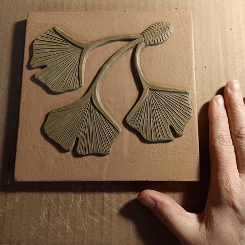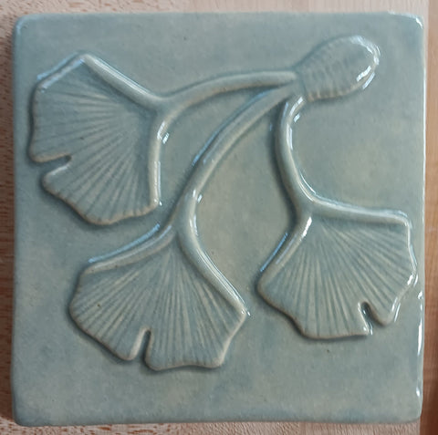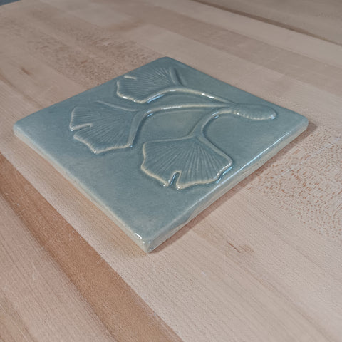 The Triple Ginkgo Leaf Handmade Tile is now available in the six inch by six inch size shown here. It is also still available in a smaller 3x3 inch size. Price listed here is for a single 6"x6" tile, group photo is for reference only.