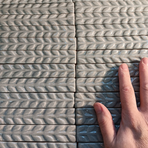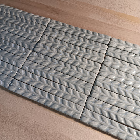 Tiny leaves on a vine repeating in this handmade 1"x6" tile. It is a simple but pretty design that will add visual interest to any tile installation. For a more subtle look, choose a lighter, low contrast glaze like white or celadon. For more drama, select a deeper colored glaze like leaf green or watercolor blue.