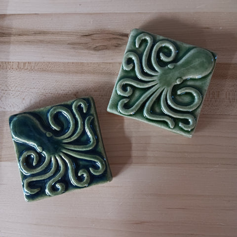 Octopus 3"x3" Ceramic Handmade Tile - leaf green and spearmint glaze pair